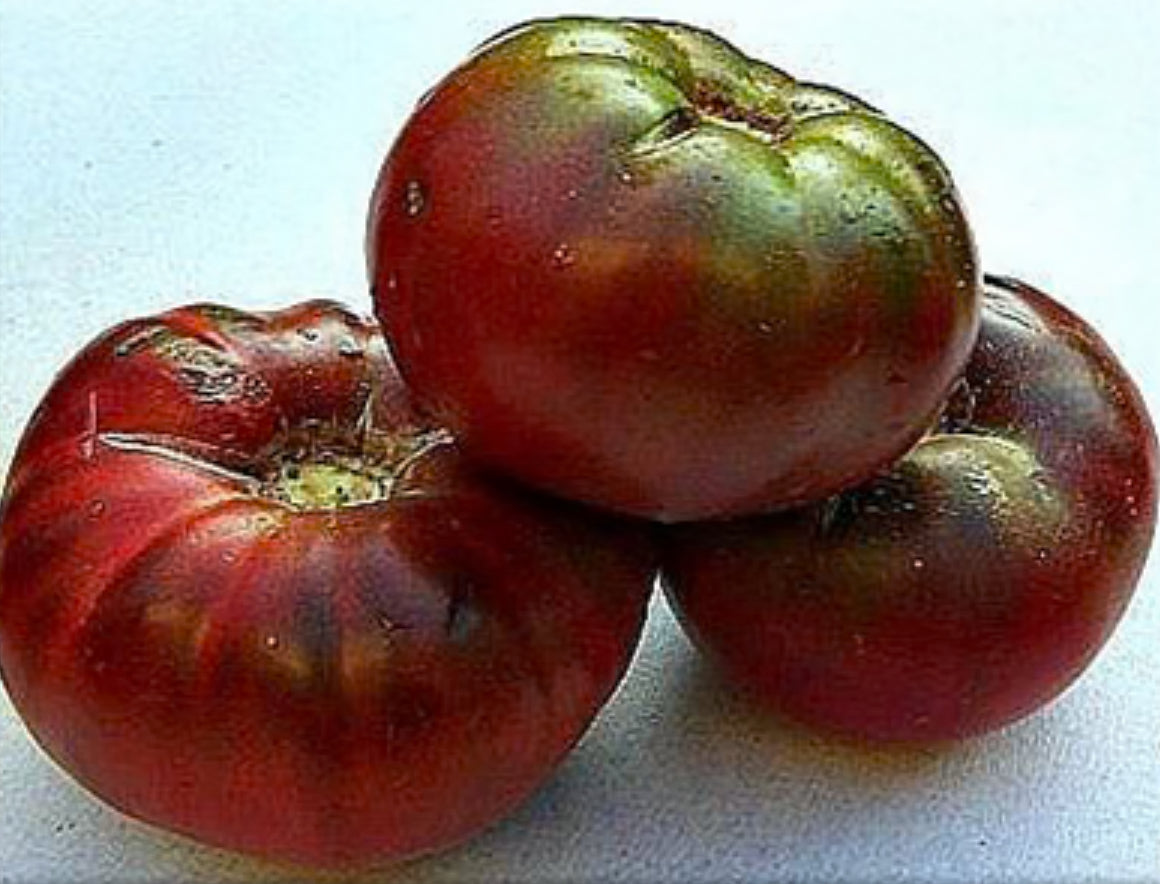 A Russian heirloom with mahogany brown colored fruit and olive green shoulders. The fruit average 8-10 oz. and have a nice rich flavour. Determinate. Potato-leaf foliage. (70 days from transplant)